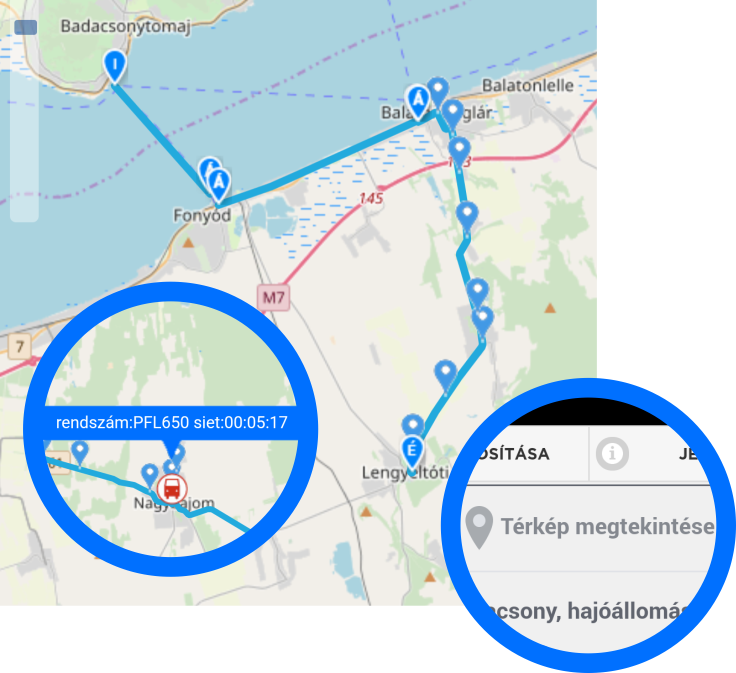 A gombostű ikonra kattintva az OSM alapján generált térképünkön megtekintheti utazásának útvonalát és az érintett megállóit is. Ha rendelkezésünkre áll, megjelennek késési információk is.